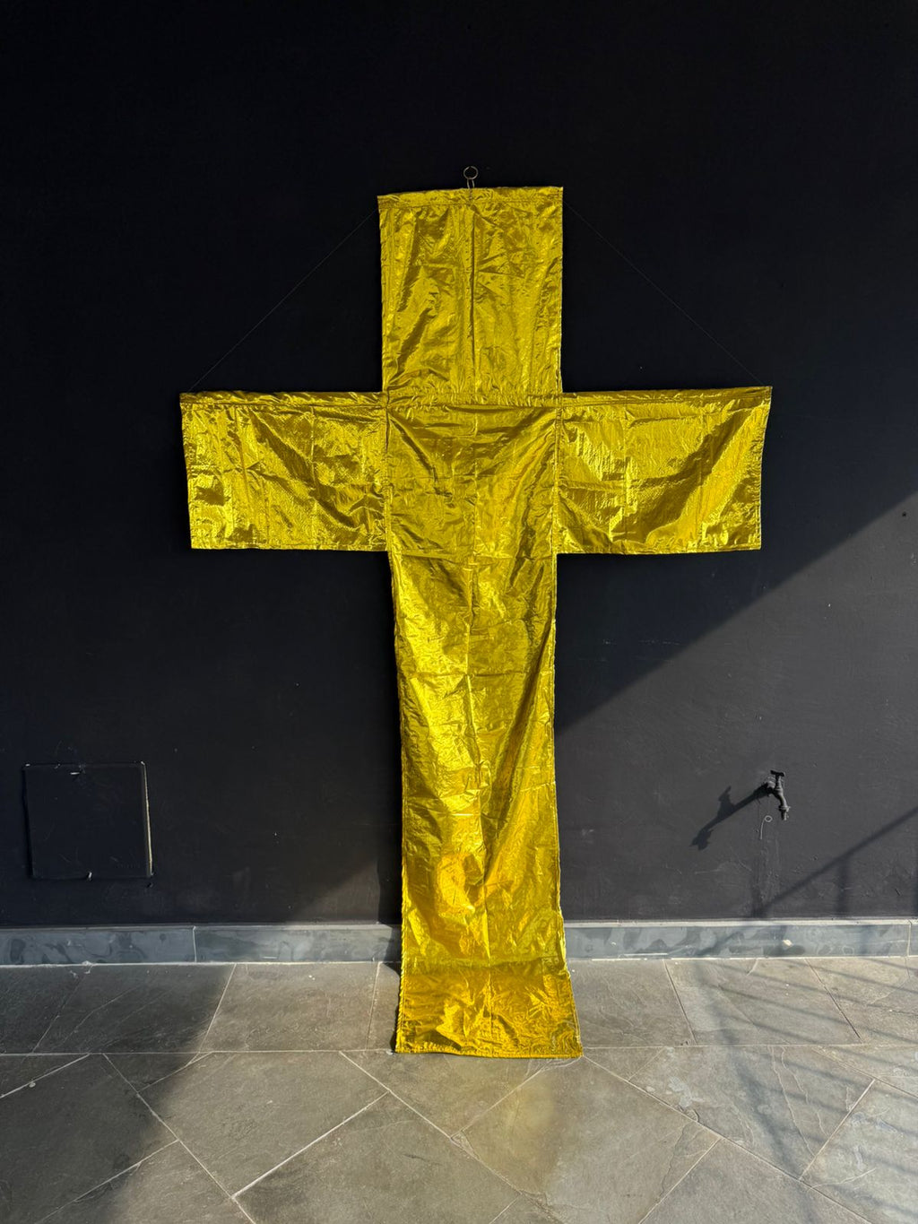 Feita em tecido lamê, composto por finas lâminas metálicas entrelaçadas ao poliéster, esta pipa em formato de cruz exibe brilho metálico intenso em ambos os lados — refletindo luz e impactando o ambiente com beleza e reverência